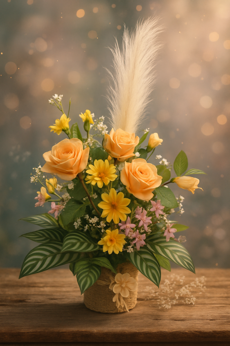 Bouquet éclatant. Un bouquet solaire où roses orangées, jaunes et rose tendre s’unissent. Les hampes blanches élancent la lumière, une plume dorée apporte légèreté, et le feuillage panaché encadre l’ensemble avec éclat.