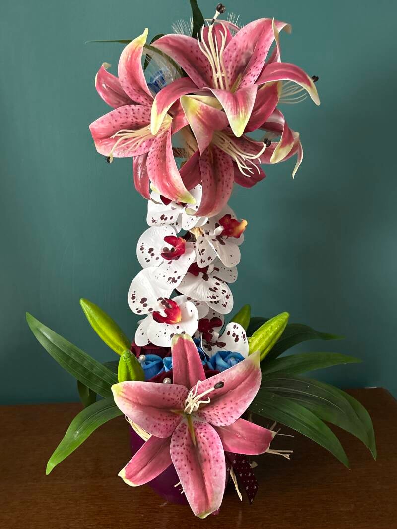 Bouquet sculptural : Lys étoiles majestueux, orchidées élégantes et roses profondes bordeaux et bleu royal. Une composition raffinée et audacieuse.