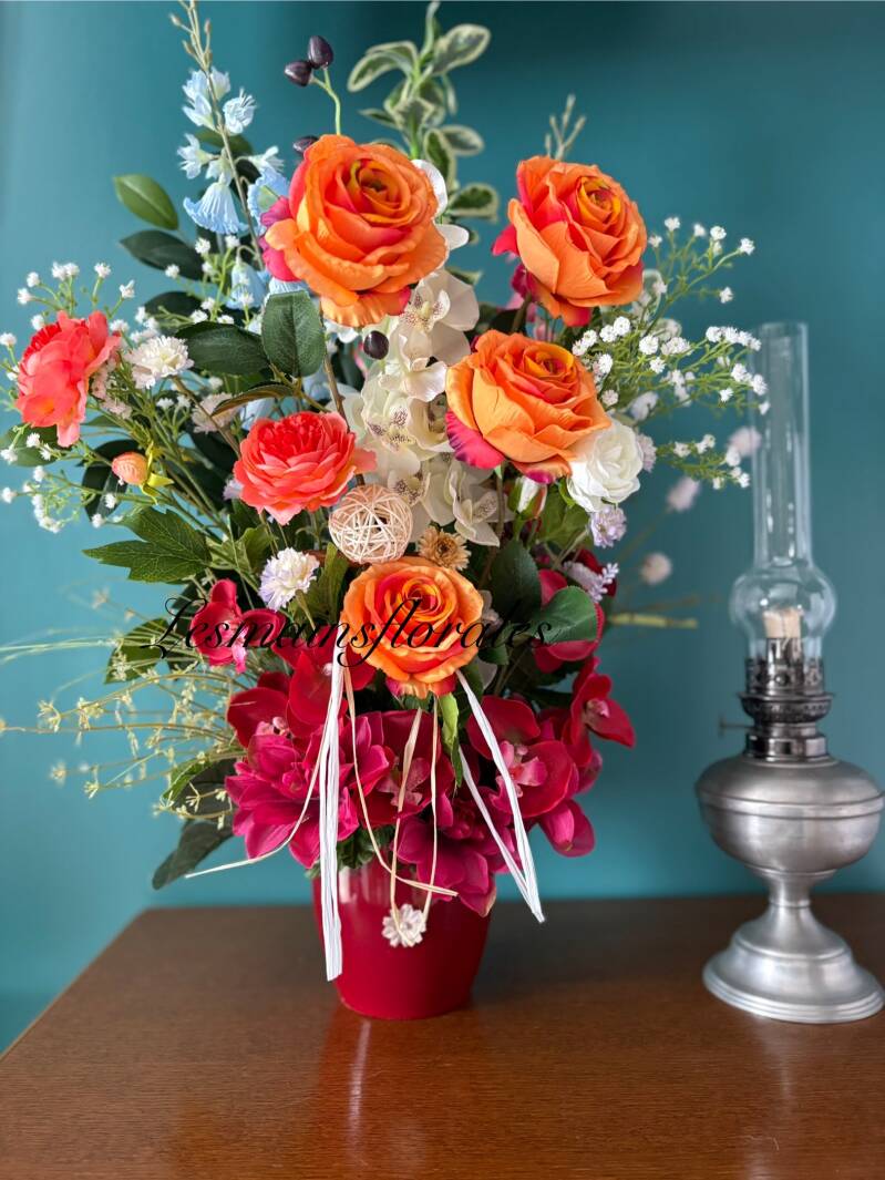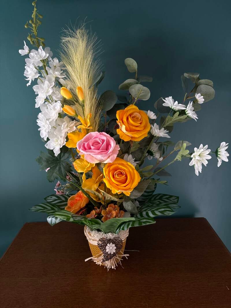 Un éclat chaleur s'élève dans ce bouquet vibrant de vie les roses orangées y dansent. Comme des flammes joyeuses, portées par un crin de fleurs tendres et lumineuses. Un hommage à la force douce à l'élan du cœur à la beauté qu'on ose offrir. Dimension : hauteur 74cm largeur 50 cm.
