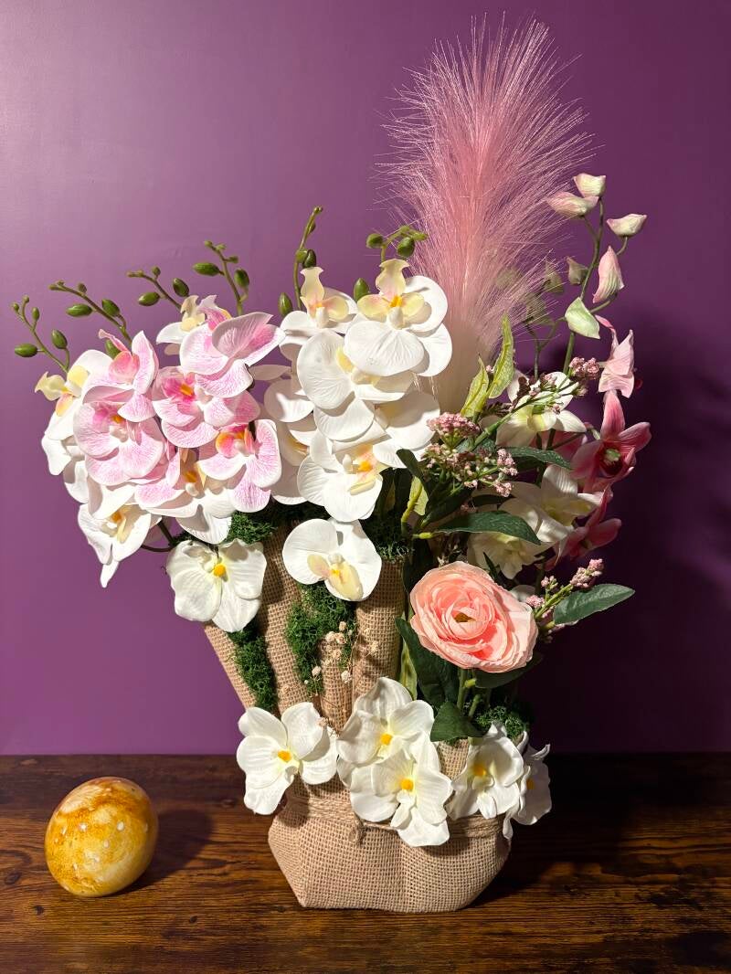 45 euros - La création florale Élévation Rosée se distingue par son harmonie de tons doux et sa composition verticale élégante. Des orchidées blanches et rosées sont mises en valeur par des feuillages délicats et une touche aérienne de rose poudré, apportant légèreté.