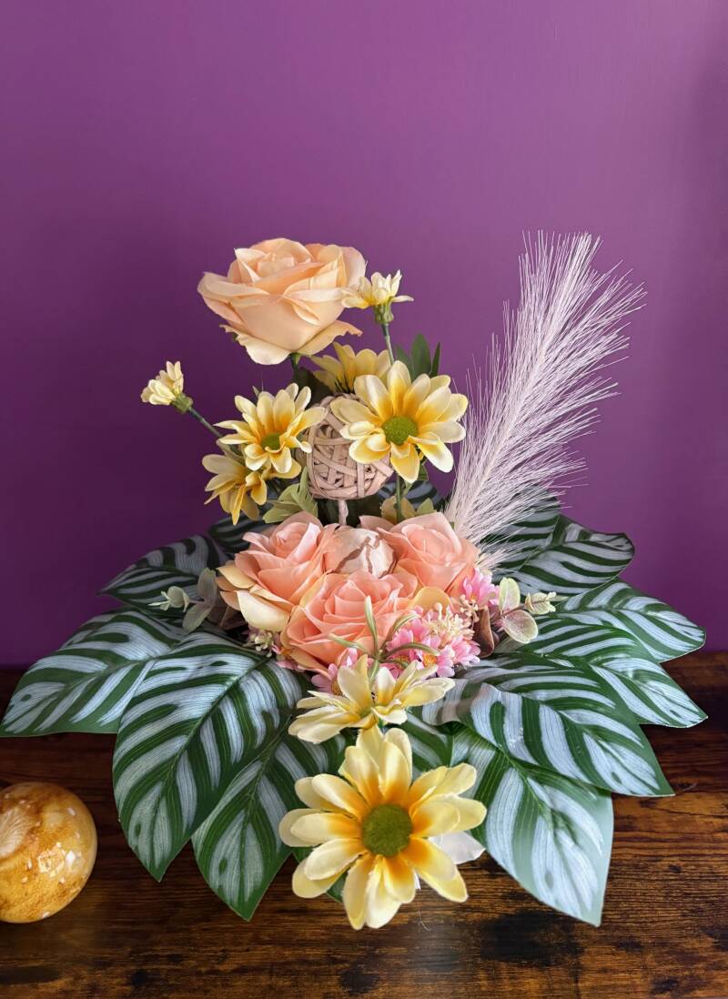 Cette composition florale mêle des tons poudrés de rose, de crème et de vert doux, créant une présence à la fois élégante et apaisante. Les fleurs aux pétales délicats s’entrelacent avec un feuillage mat dans un équilibre naturel et harmonieux. Elle apporte une touche de lumière sans jamais s’imposer. Création unique façonnée avec soin, idéale à offrir ou simplement pour se faire plaisir.