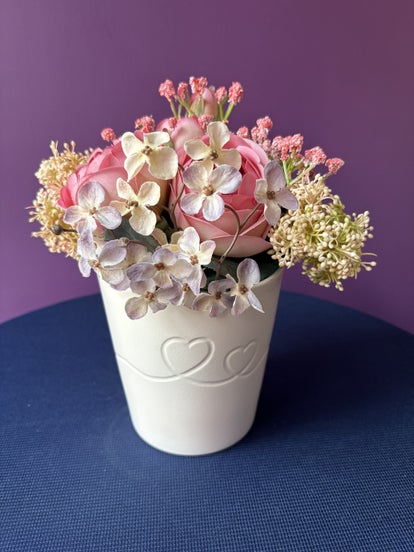Une composition florale douce et éclatante, déclinée dans des nuances de rose et de mauve pour instaurer une ambiance tendre et joyeuse. De généreuses roses s’entrelacent avec de petites fleurs pastel et des graminées légères, pour un effet aérien, poétique et frais. Le contenant fuchsia, une touche artisanale et chaleureuse qui sublime l’ensemble. Parfaite pour offrir, illuminer un intérieur ou créer une atmosphère douce et conviviale. Pièce unique – création artisanale Les Mains Florales.