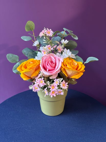 Un bouquet éclatant où se mêlent roses orangées, jaunes et rose tendre s'unissent .✨ Pièce unique – Création artisanale 🪻 Vase inclus