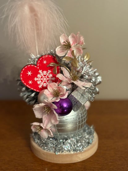 Au centre, une boule argentée accueille des fleurs délicatement teintées de rose, entourées de pommes de pin argentées et d’un nuage de plumes pâles.