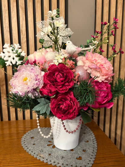 L’Éclat du Cœur Rose est une création florale unique, douce et scintillante, née de l’harmonie entre le rose tendre et l’argent lumineux. Au centre, une boule argentée accueille des fleurs délicatement rosées, entourées de pommes de pin argentées et d’un léger nuage de plumes pâles. L’ensemble inspire tendresse, douceur, espoir et chaleur, même au cœur de l’hiver. Réalisée avec des fleurs roses aux pétales givrés, des pommes de pin argentées, une plume rose poudré, une boule décorative argentée et une petite base en bois naturel, elle peut aussi s’agrémenter de touches festives comme un cœur rouge, de mini-cadeaux ou de décorations scintillantes. Les couleurs dominantes sont le rose tendre, l’argent, le blanc nacré et quelques éclats d’or, pour transmettre la douceur qui apaise, la lumière qui renaît et le cœur qui s’ouvre.