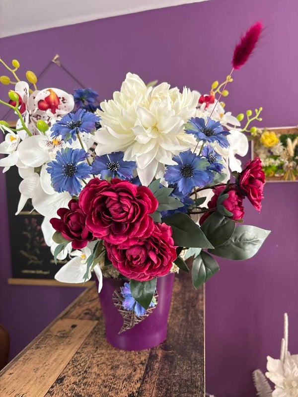 “Éclat d’Harmonie” est une création florale unique où se rencontrent la profondeur du rouge, la sérénité du bleu et la pureté du blanc.