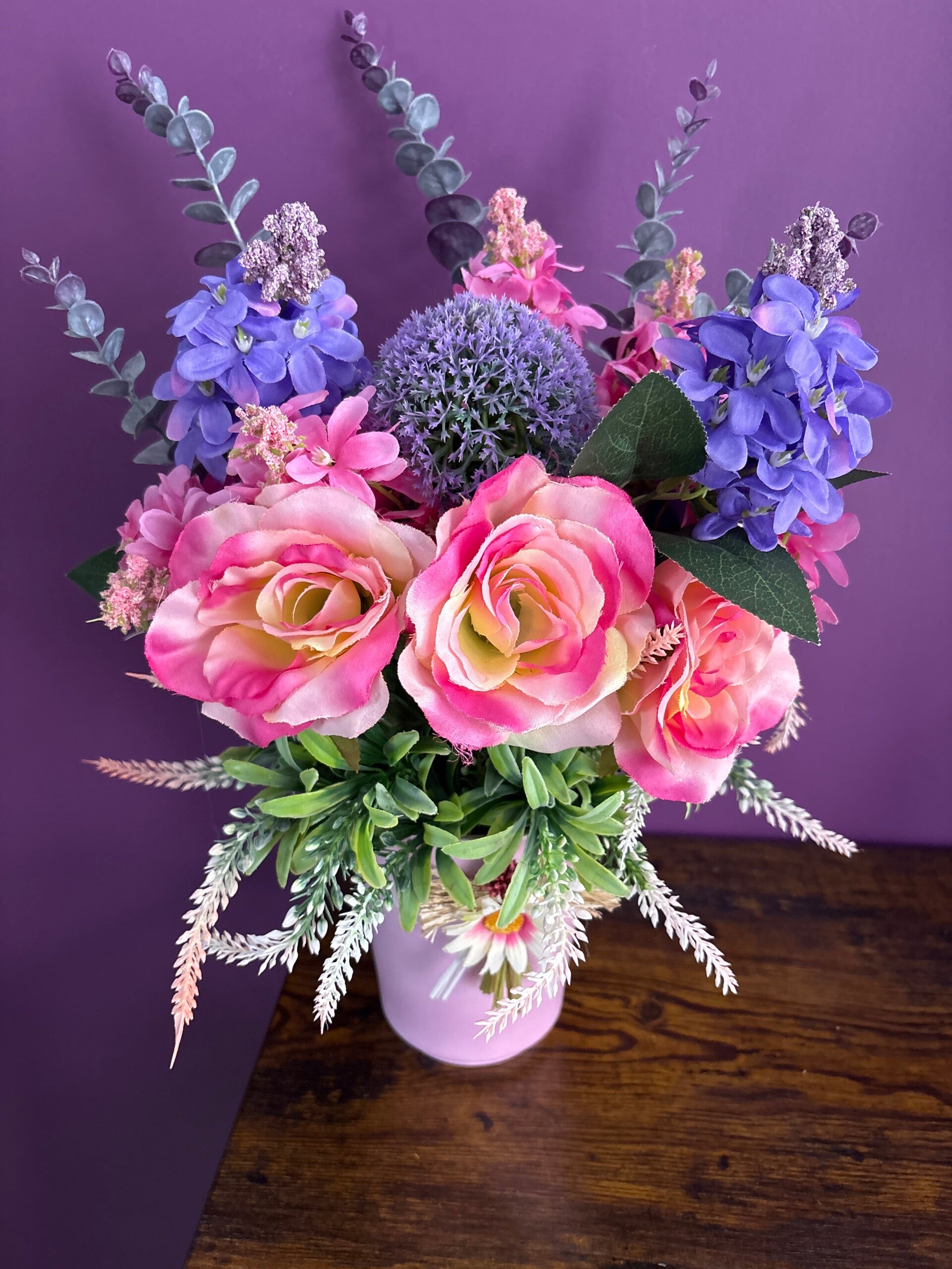 Une composition florale élégante et éclatante, où les roses aux nuances rose-orangé se marient aux tons violets profonds pour créer une ambiance douce et raffinée. Le cœur arrondi violet ajoute une note originale et moderne, tandis que les feuillages texturés apportent un volume naturel et harmonieux. Cette création unique diffuse une atmosphère chaleureuse et apaisante dans votre intérieur, idéale pour mettre en valeur un salon, une entrée ou un coin détente.