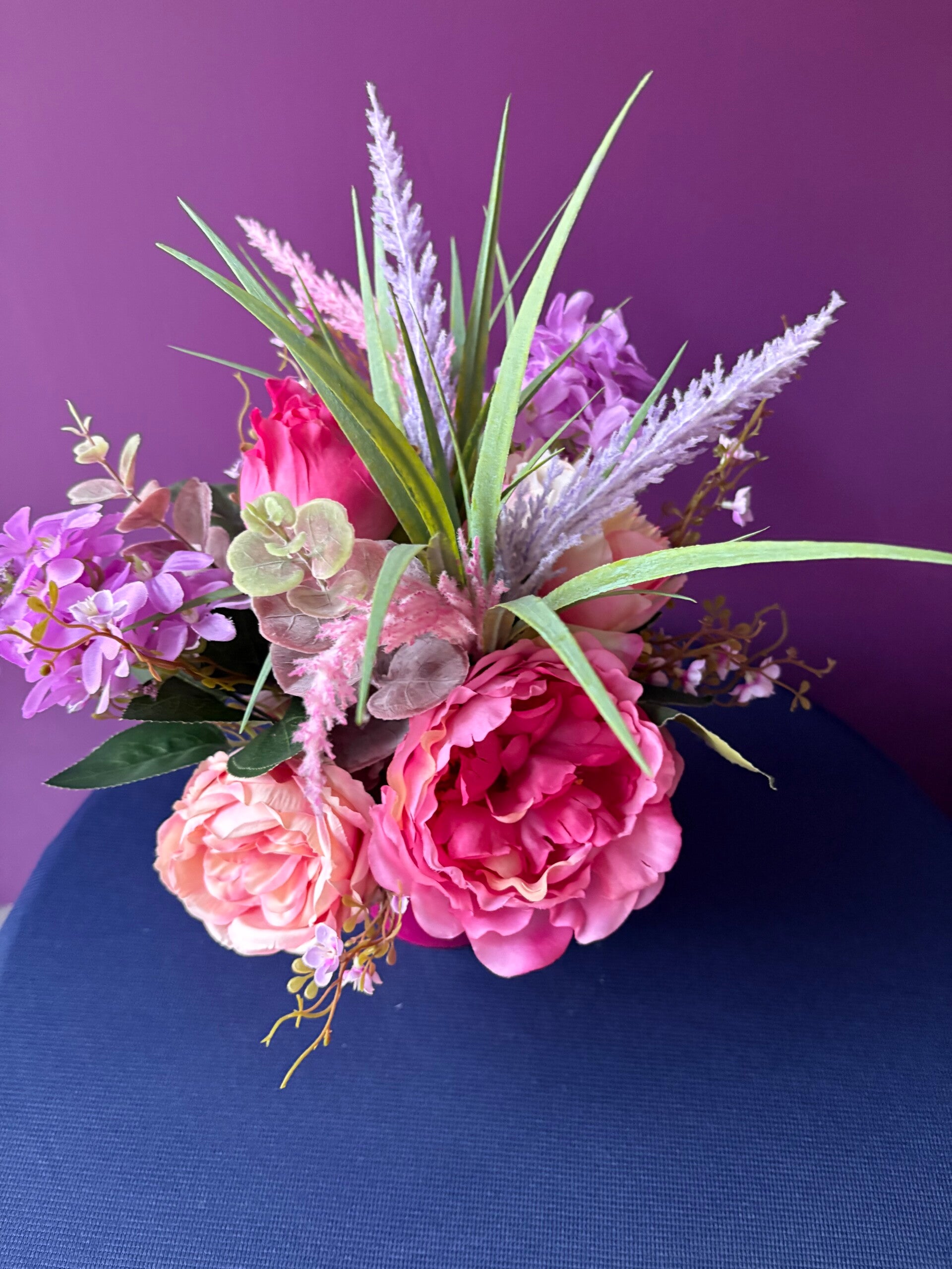 Une composition florale douce et éclatante, déclinée dans des nuances de rose et de mauve pour instaurer une ambiance tendre et joyeuse. De généreuses roses s’entrelacent avec de petites fleurs pastel et des graminées légères, pour un effet aérien, poétique et frais. Le contenant fuchsia, une touche artisanale et chaleureuse qui sublime l’ensemble. Parfaite pour offrir, illuminer un intérieur ou créer une atmosphère douce et conviviale. Pièce unique – création artisanale Les Mains Florales.