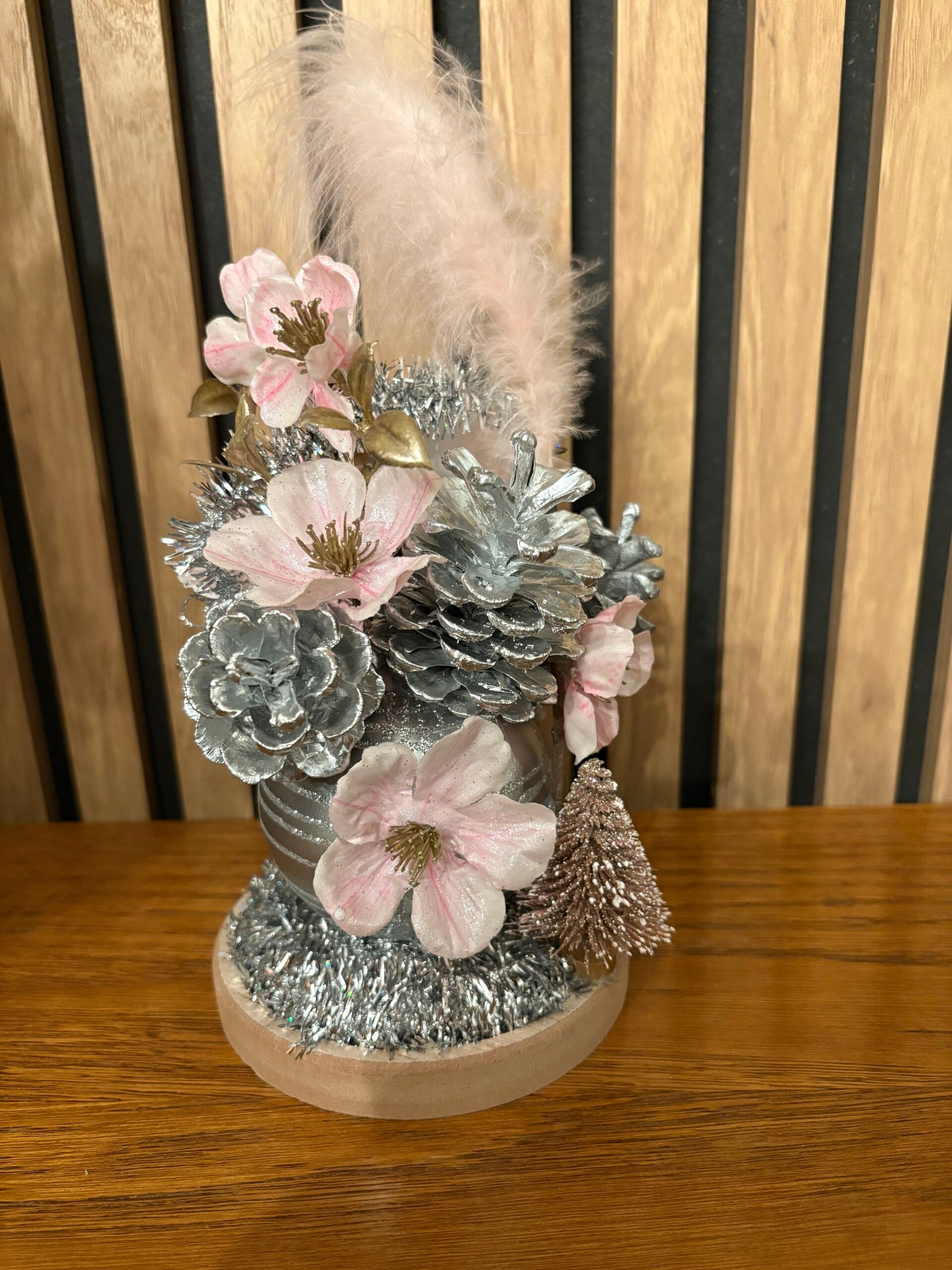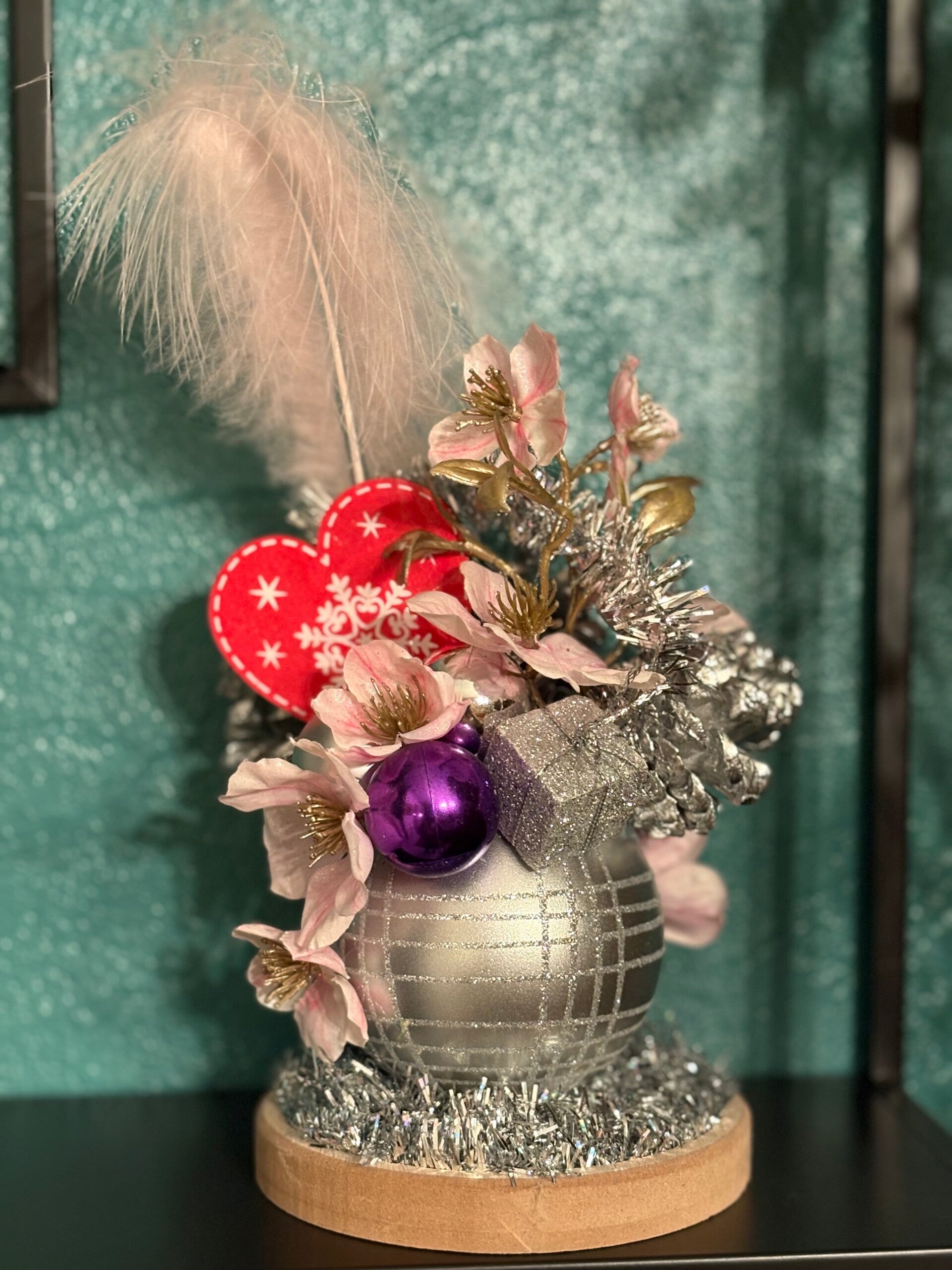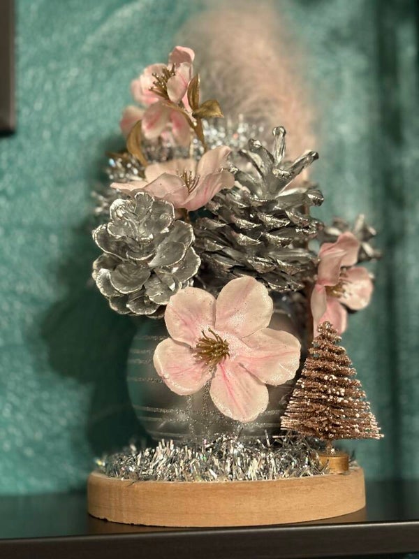 L’Éclat du Cœur Rose est une création florale unique, douce et scintillante, née de l’harmonie entre le rose tendre et l’argent lumineux. Au centre, une boule argentée accueille des fleurs délicatement rosées, entourées de pommes de pin argentées et d’un léger nuage de plumes pâles. L’ensemble inspire tendresse, douceur, espoir et chaleur, même au cœur de l’hiver. Réalisée avec des fleurs roses aux pétales givrés, des pommes de pin argentées, une plume rose poudré, une boule décorative argentée et une petite base en bois naturel, elle peut aussi s’agrémenter de touches festives comme un cœur rouge, de mini-cadeaux ou de décorations scintillantes. Les couleurs dominantes sont le rose tendre, l’argent, le blanc nacré et quelques éclats d’or, pour transmettre la douceur qui apaise, la lumière qui renaît et le cœur qui s’ouvre.