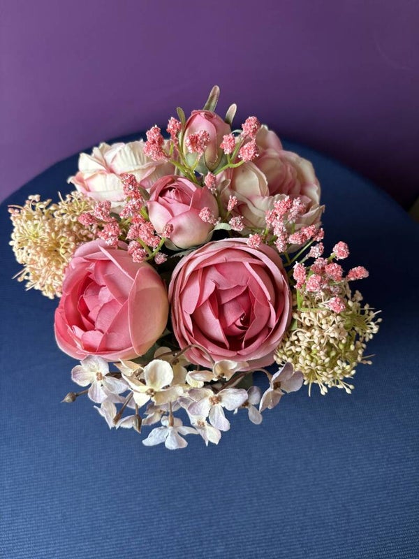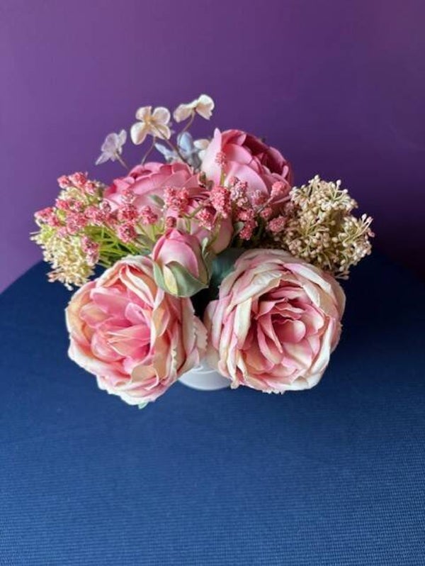 Vase en porcelaine rose pâle orné de quatre pivoines écloses et de deux boutons en train de s’ouvrir, accompagné de mimosa rose et de deux branches de verne rose pâle. L’ensemble dégage une harmonie délicate aux tons doux et poudrés, rappelant la fraîcheur et la finesse du printemps.