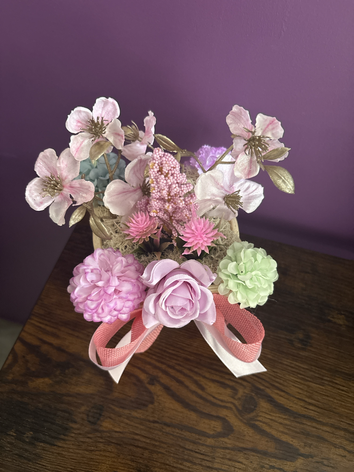 Ses teintes roses poudrées, ses fleurs légères et ses touches de vert tendre composent une harmonie apaisante, idéale pour réchauffer un intérieur ou offrir un message du cœur.