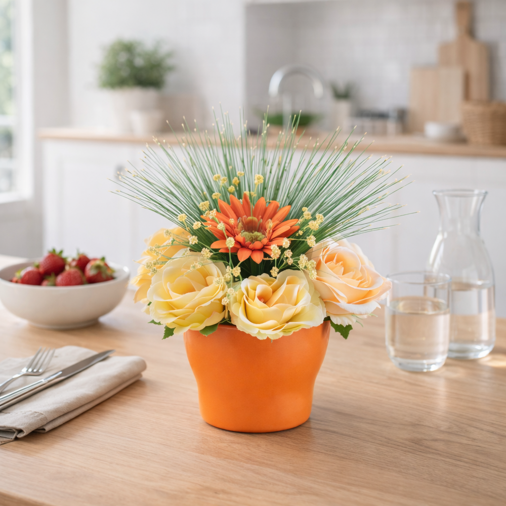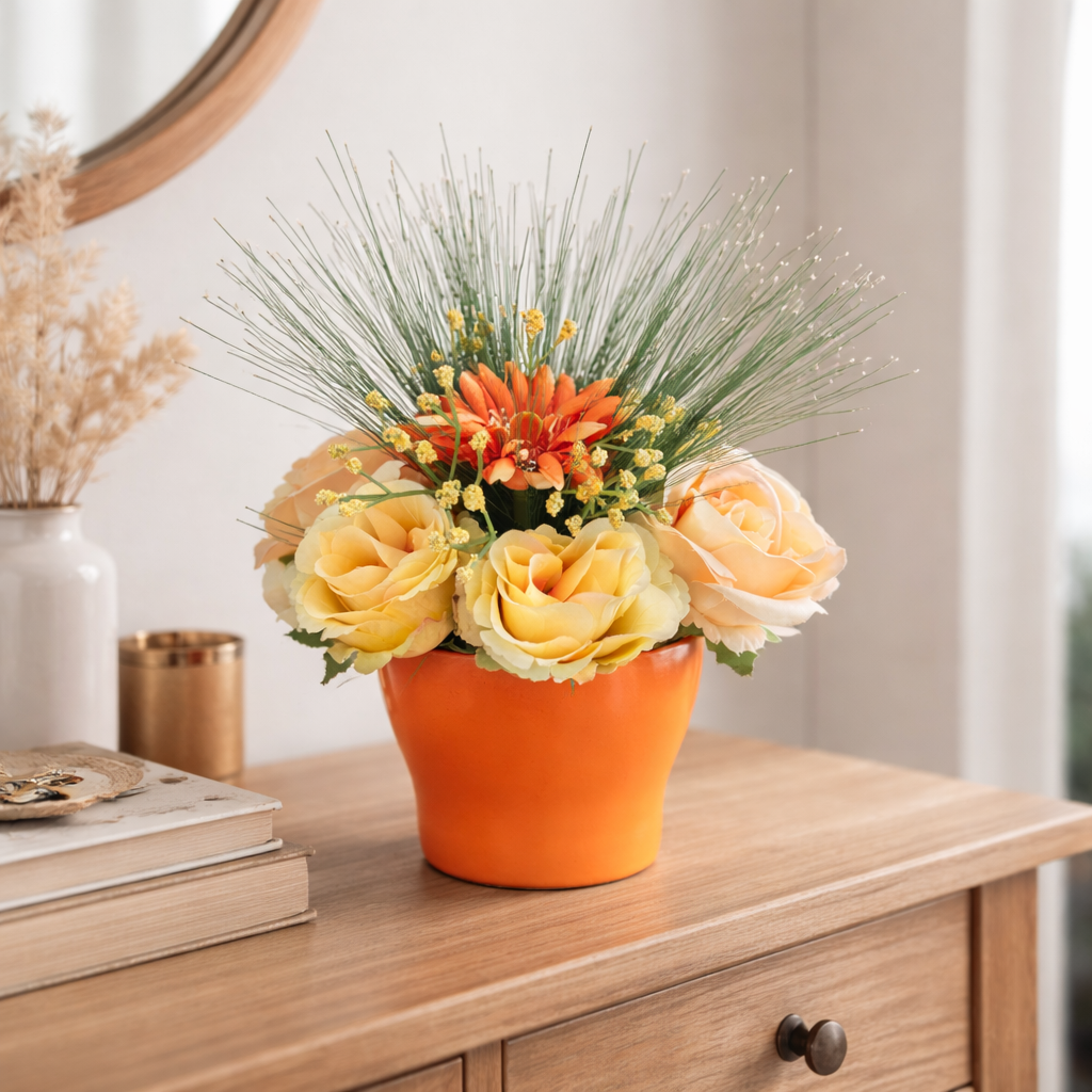 Création florale artisanale réalisée à la main, dans un pot orange chaleureux.