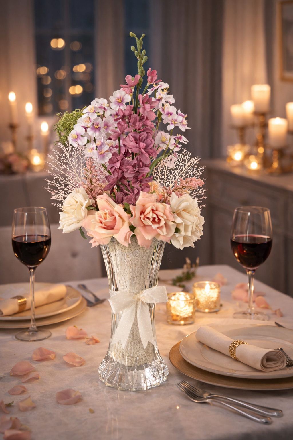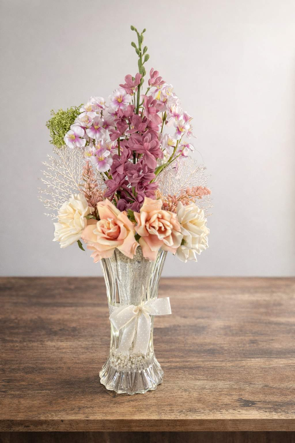 Composée de roses délicates aux nuances poudrées, de fleurs légères et aériennes, ainsi que de touches végétales subtilement équilibrées, elle apporte une atmosphère apaisante et lumineuse à votre intérieur.
